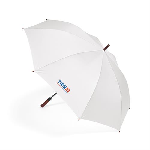 Com painéis de rPET, haste e varetas de fibra de vidro, é um guarda-chuva resistente ao vento com abertura automática